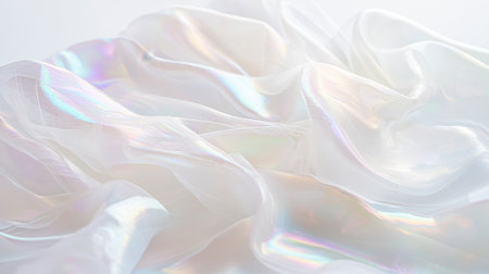 This image showcases soft white organza fabric with iridescent hues, draped gracefully over a light background, ideal for textiles, fashion, and decor.