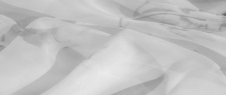 Soft grayscale fabric with delicate transparency and subtle floral details, creating a gentle flow. The sheer material exudes elegance and lightness, showcasing a graceful swirl