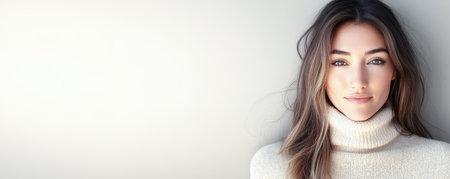 A young woman with long flowing hair smiles softly while wearing a warm turtleneck sweater. She stands against a light neutral background that enhances her natural beauty.