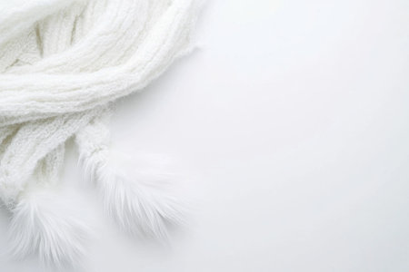Warm white scarf with furry ends placed on smooth background.
