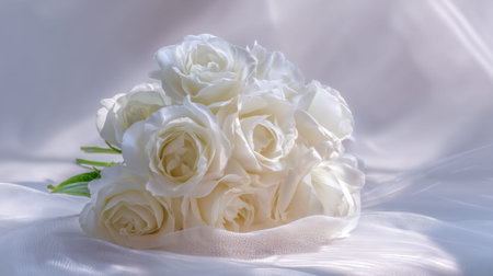 A stunning bouquet of white roses delicately arranged on a soft fabric background, capturing the essence of elegance and romance for any celebration or decor.