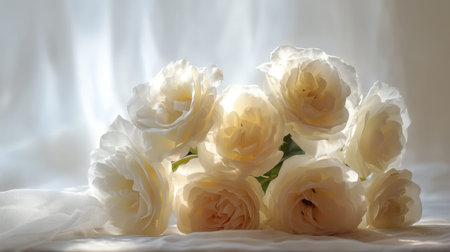 A beautiful composition of white roses gently arranged on soft fabric, illuminated by natural light. This serene floral image evokes feelings of elegance and freshness.