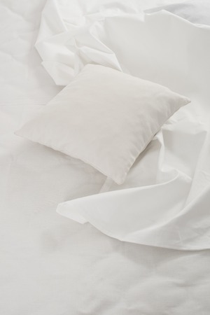 New snow-white bed, pillows and crumpled sheets, white linen cloth, white abstract background.