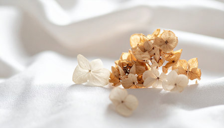 dried hydrangea flowers on a white fabric background.