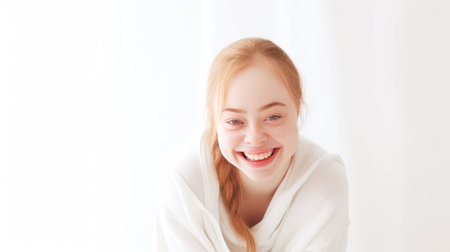 Portrait of smiling laughing woman with Down syndrome white background. Advertisement of men's cosmetics products, hair care products, medicines, perfumes, cosmetology, courses, school college and trainings. lifestyle, World Day of Genetic Diseases