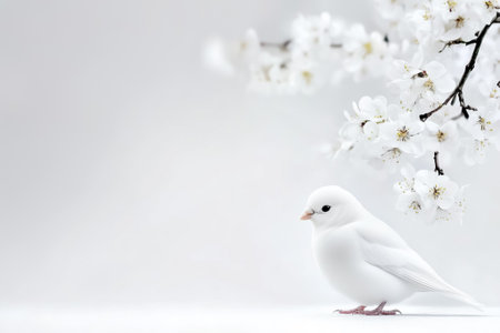 A serene white bird rests by delicate cherry blossoms under a clear blue sky, celebrating spring's beauty.