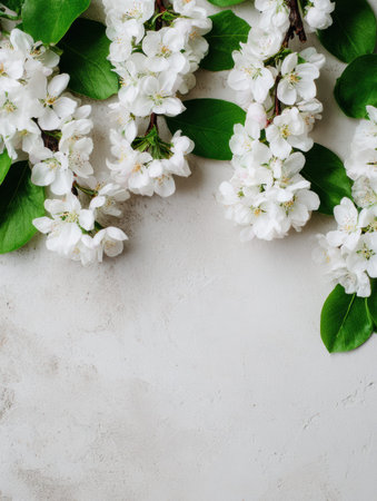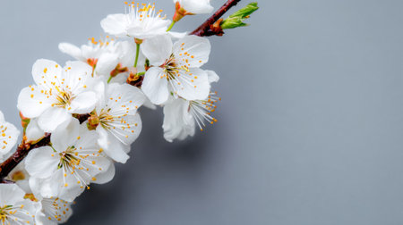 White flowers on a gray background create a fresh look. This scene highlights the beauty of spring and offers plenty of space for text.