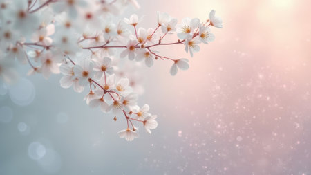 Delicate cherry blossoms in soft pastel light with sparkling background. That the image is generated using AI.