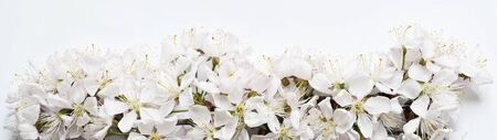 Spring banner, copy space. Blooming tree. Branch with white flowers on a light background. Selective focus, bokeh