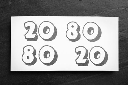 Sheet of paper with numbers 20 and 80 on black slate background, top view. Pareto principle concept