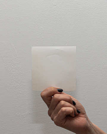 Close-up of a hand holding a blank white sheet, perfect for adding text or graphics, against a plain background
