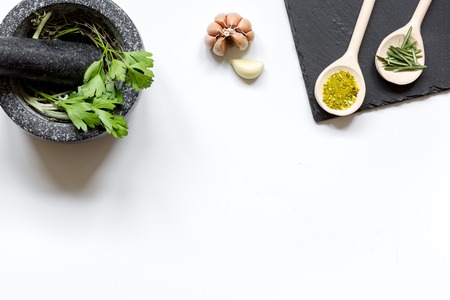 spices for cooking and fresh salad with pounder on white background top view