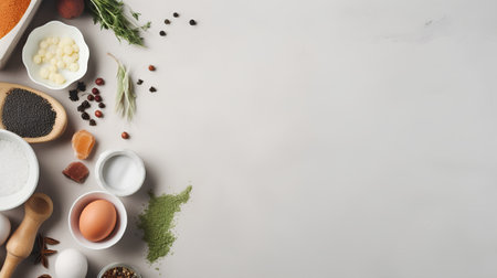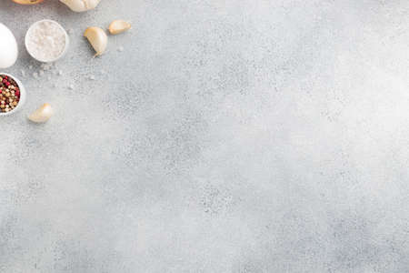 Gray background witt cooking ingredients top view