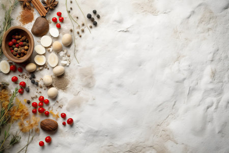 Minimalist kitchen counter with scattered ingredients and copy space in the middle.