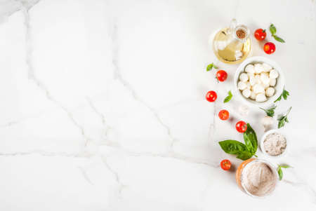 Homemade pasta pizza italian food ingredient on white marble table with flour, olive oil, basil, tomatoes and kitchen accessories top view