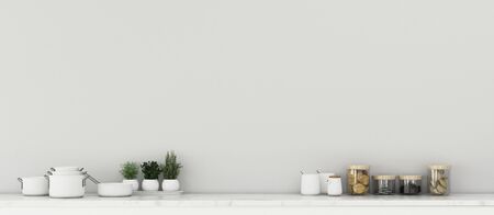 Kitchen space in house.White room with candy on counter kitchen . modern interior design. -3d rendering