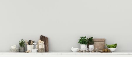 Kitchenware and utensils on a white shelf or counter. Banner with a white wall background and copy space. Kitchen cooking decor.