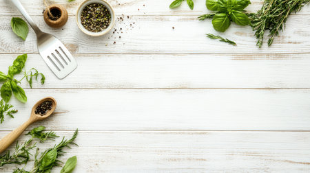 A bright and inviting display of fresh herbs and spices arranged on a rustic wooden table, perfect for inspiring culinary creativity and recipe development.