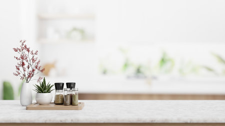 Seasoning bottle, flower vases, and empty space for display product on a tabletop in a modern white kitchen. close-up image. 3d render, 3d illustration