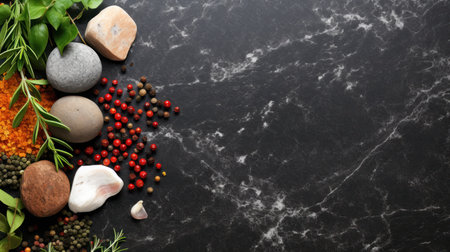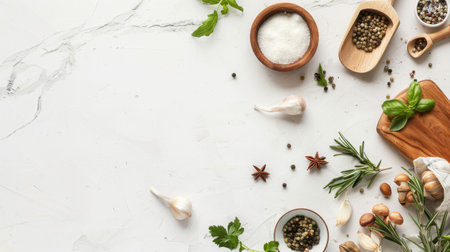 A visually appealing arrangement of fresh herbs and spices on a marble surface perfect for food enthusiasts and culinary experts.