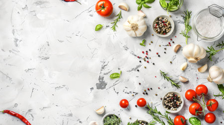 A white surface is covered in fresh herbs, garlic, tomatoes, and peppercorns. The ingredients are scattered artfully around the surface, creating a visually appealing and fragrant scene.