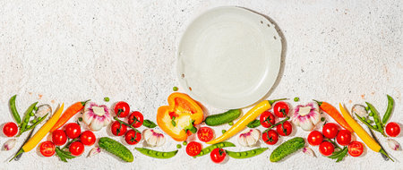 Vegan table setting. Assorted of ripe fresh vegetables, empty plate, cutlery, spices. A hard light, dark shadow, light putty background, banner format