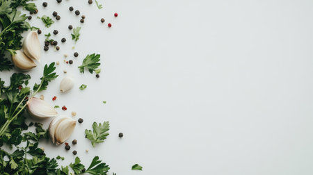 A beautiful arrangement of fresh herbs and spices including garlic and parsley on a clean surface, ideal for food styling and culinary inspiration.