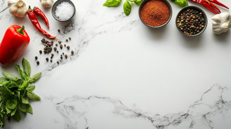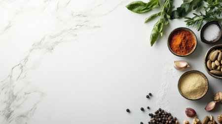 A stunning arrangement of fresh herbs and spices on a smooth marble surface, ideal for cooking, recipe creation, and food photography, showcasing vibrant colors and textures.