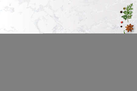 Assortment of spices and herbs on white marble background with copy space for your design. Template culinary blog social media.
