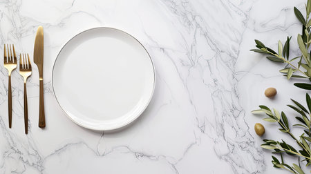 A white marble tabletop with a white plate, gold fork, gold knife, and gold spoon. An olive branch with green leaves extends from the left side of the frame.