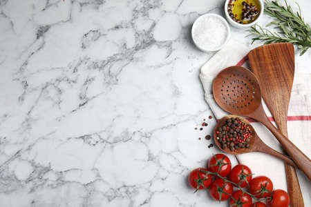 Flat lay composition with cooking utensils and fresh ingredients on white marble table. Space for text