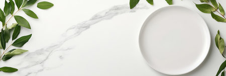 A white plate with a leafy border rests on a smooth marble surface,.