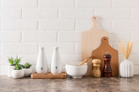 various kitchen utensils on a marble countertop in a modern kitchen. the concept of decor against the background of a white brick wall