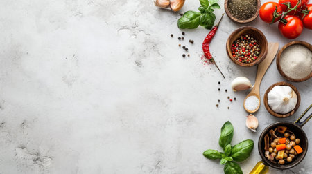 Explore a vibrant arrangement of fresh herbs and spices, perfect for creating delicious meals. This image captures essential ingredients on a light background, showcasing their natural beauty.