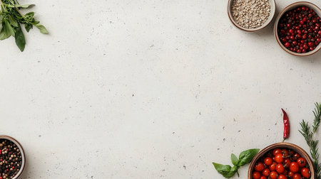 White Marble Tabletop Texture Background, Gray Textured Tablecloth, Food Table Mockup with Seasonings and Spices, Copy Space, Top View, Abstract Generative AI Illustration