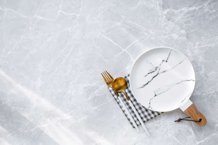 Empty white plate with cutlery on a marble table, saucer, fork and knife. The concept of diet, fasting