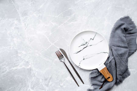 Banner. An empty ceramic marble plate with a wooden handle, a fork, a knife and a towel against the background of a gray concrete table. Space for text. Menu concept for cafes and restaurants.