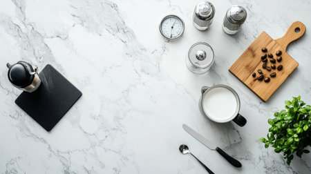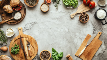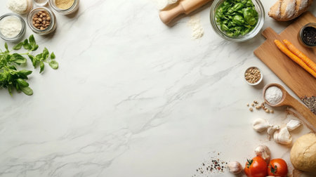 A beautiful arrangement of fresh ingredients and cooking tools on a marble kitchen surface, perfect for culinary creations and meal preparations.