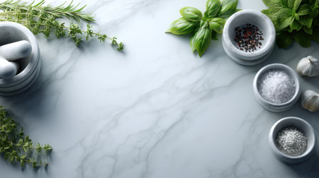 A beautiful arrangement of fresh herbs and spices displayed on a marble surface. Includes mortar and pestle, garlic, and various seasonings perfect for cooking.