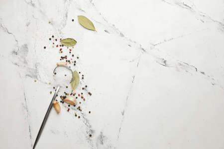 Composition with different spices on light background
