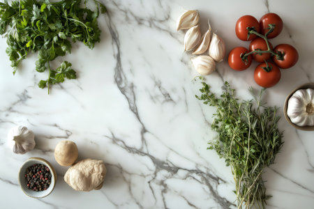 A beautiful arrangement of fresh cooking ingredients on a marble countertop, featuring vibrant tomatoes, herbs, and spices ideal for culinary creations.
