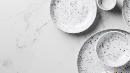 Ceramic tableware on white marble background. Top view.