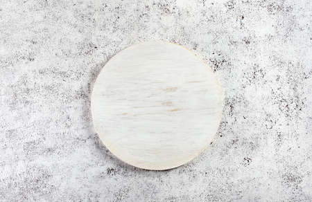 Wooden white cutting board over light stone background with free text space. Top view, flat lay