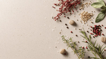 Herbs and spices on beige background. Top view with copy space
