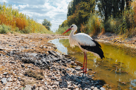 A stork stands on the bank of a dry river on a sunny summer day. The concept of climate change, drought and drying up of reservoirs