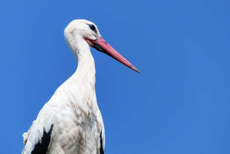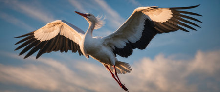 White Stork flying in a blue sky. With large spread wings. Detailed bird. Web banner for social media