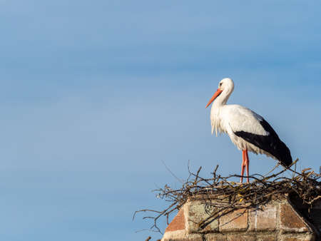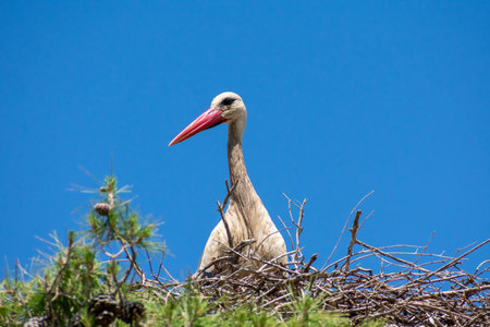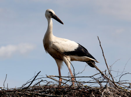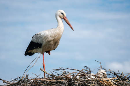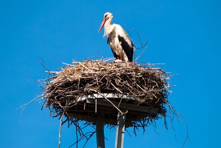 Early spring scene. Storks in a nest with a blue sky in the background.