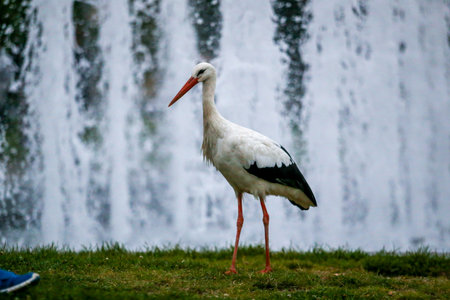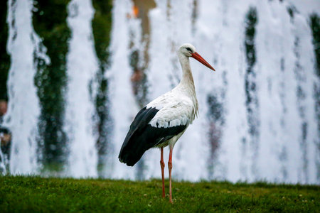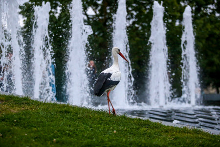 A white stork standing gracefully near a city fountain. The elegant bird contrasts with the splashing water and urban background, creating a rare moment where wildlife meets modern life in the heart of the city