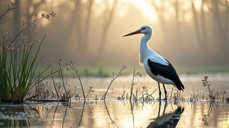 Elegant white stork in tranquil wetland at sunrise with soft lighting. That the image is generated using AI.