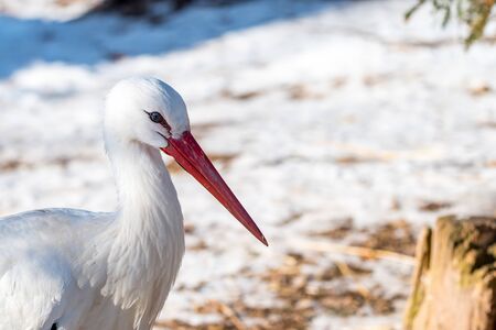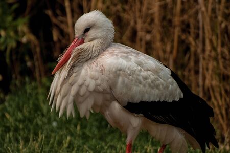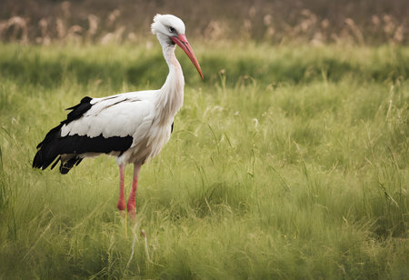 White stork ciconia ciconia the bird is walking in the meadow dawn.
